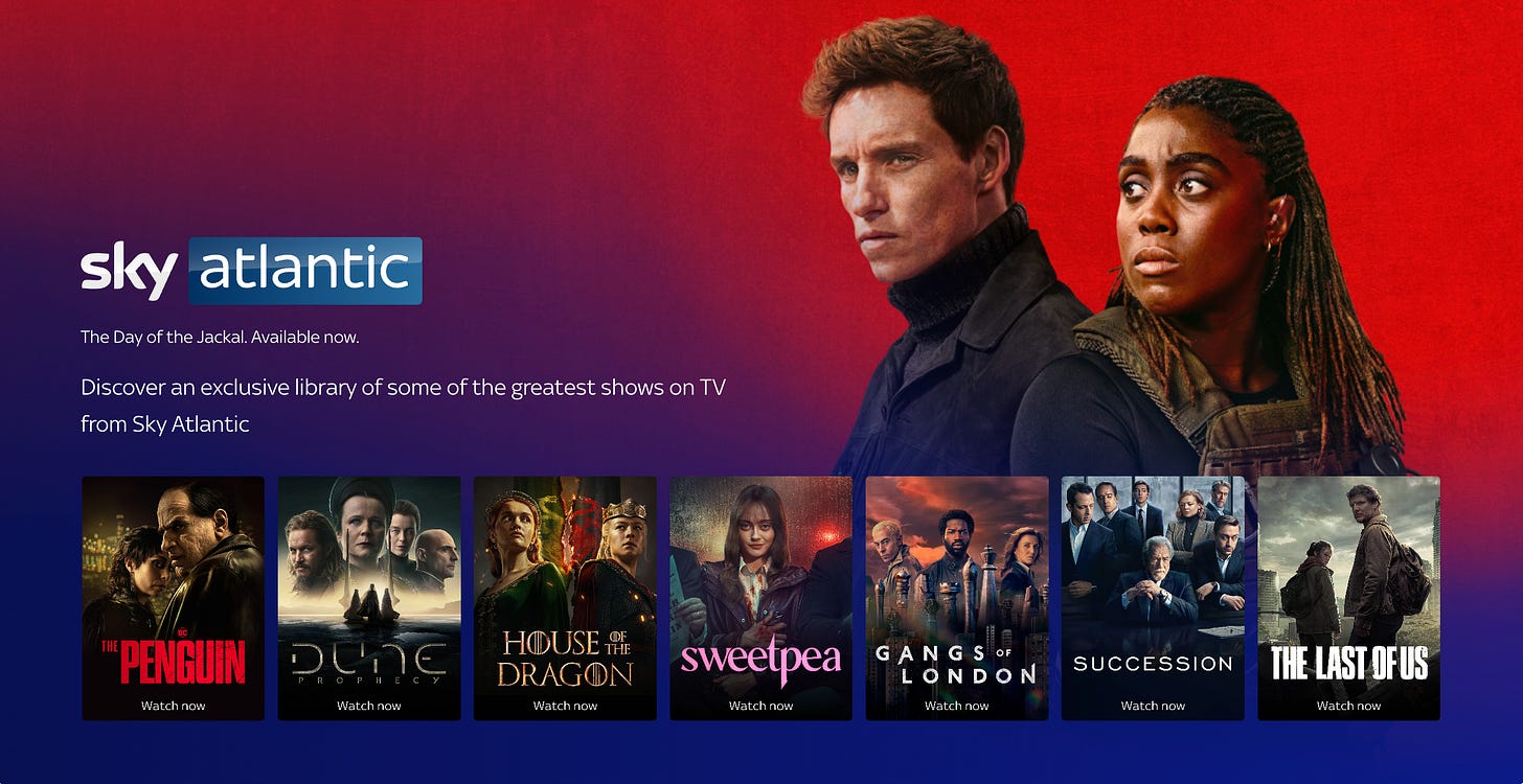 In the U.K., Sky Atlantic includes Sky originals (Day of the Jackal, Sweetpea, Gangs of London), HBO originals (House of the Dragon, The Penguin), and has an add-on option for Paramount+.
